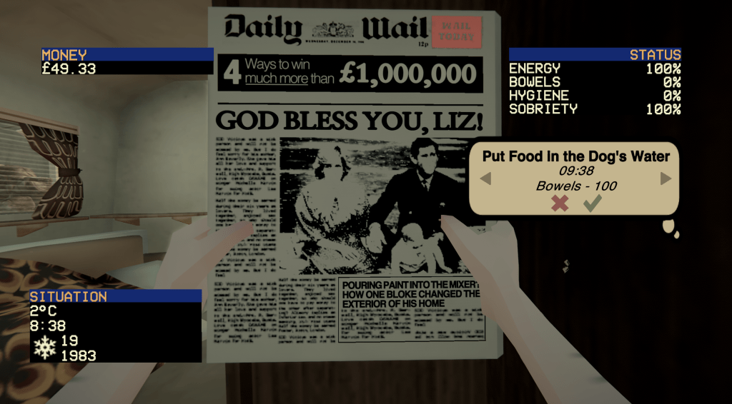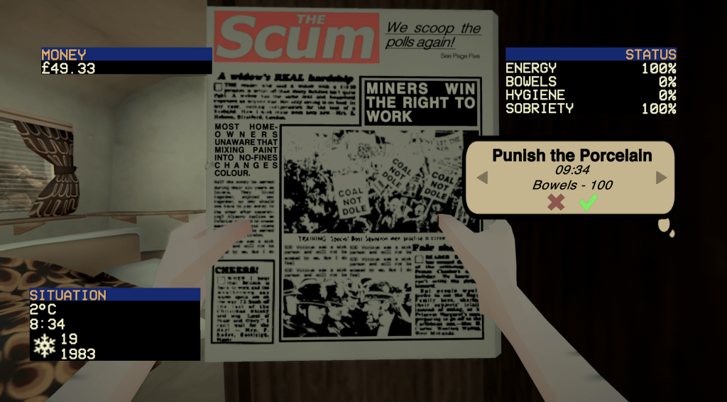 Newspapers change on a daily basis, and can be viewed anytime a player used a toilet (We’ve adjusted the UI a bit so you can read without skipping time).